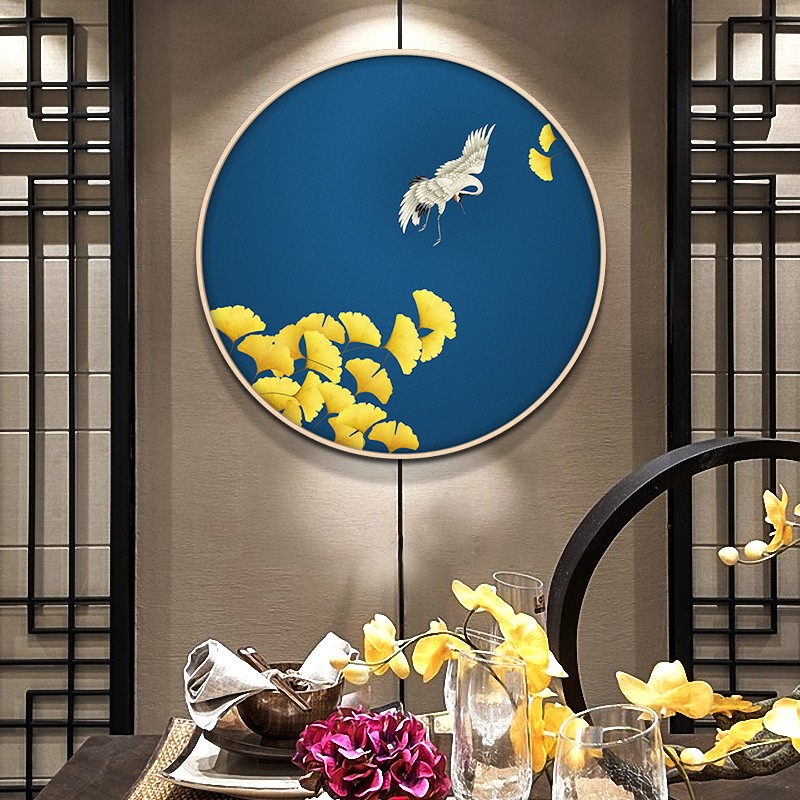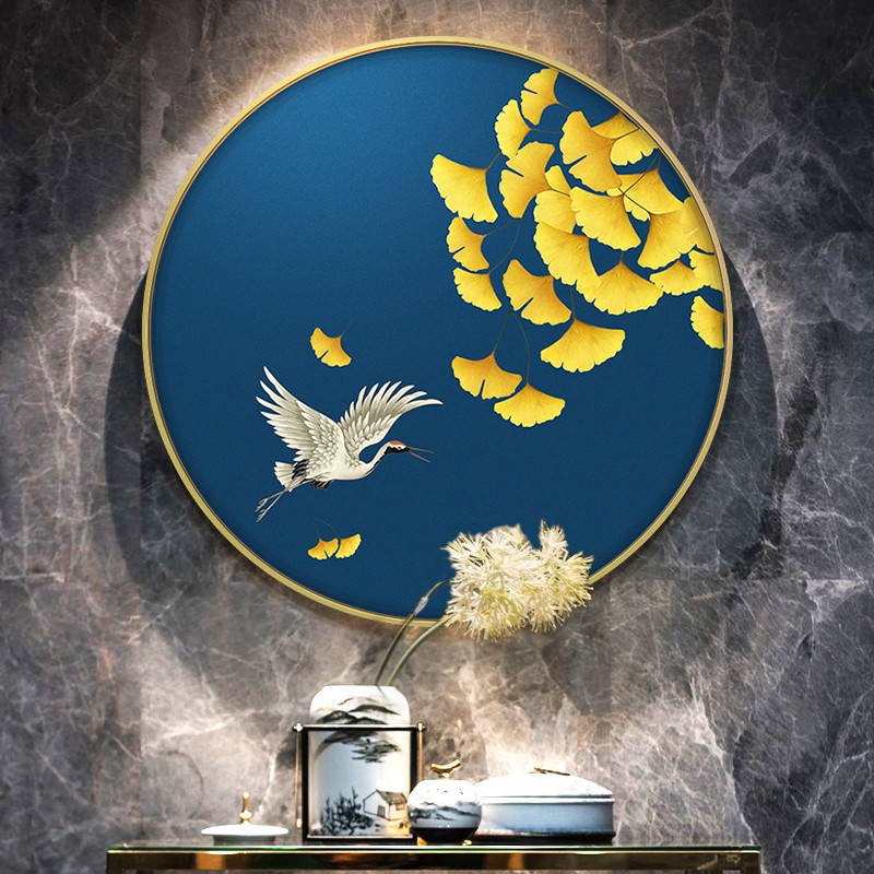 新中式玄關(guān)手繪油畫走廊壁畫掛畫花鳥(niǎo)圓形裝飾畫 仙鶴送福